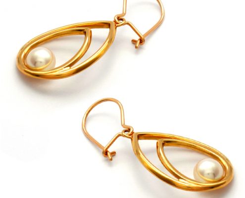 The top of the gold twisted DNA helix is attached below the pearl section of the top part of the earring via a jump ring method, allowing an element of movement when the earring is worn.
