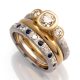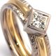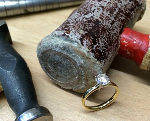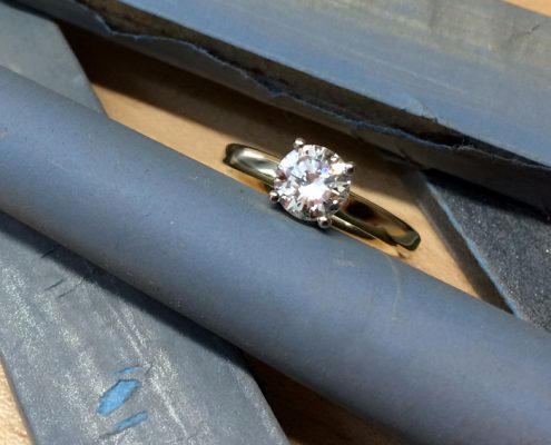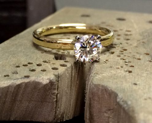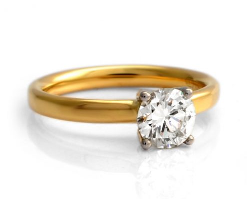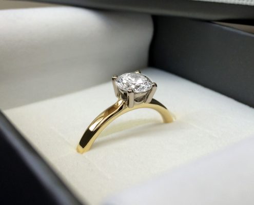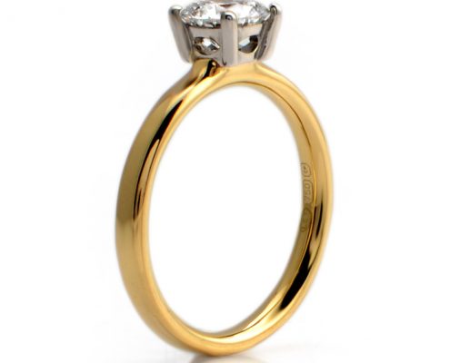 The clients stunning 1.25ct round brilliant White Diamond was re-used in this engagement ring, set into an open four claw white Gold setting, on a contrasting yellow Gold band. Tiny marquise shaped windows in the sides of the setting provide an aesthetic feature whilst also letting maximum light into the Diamond. Both setting and band have a polished finish.