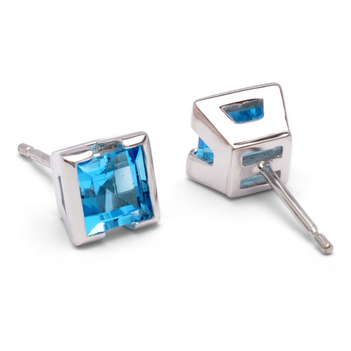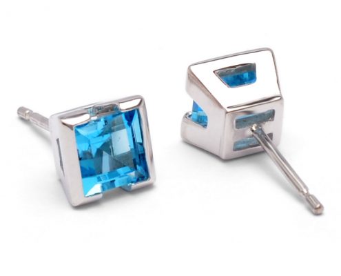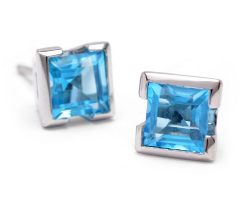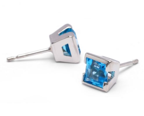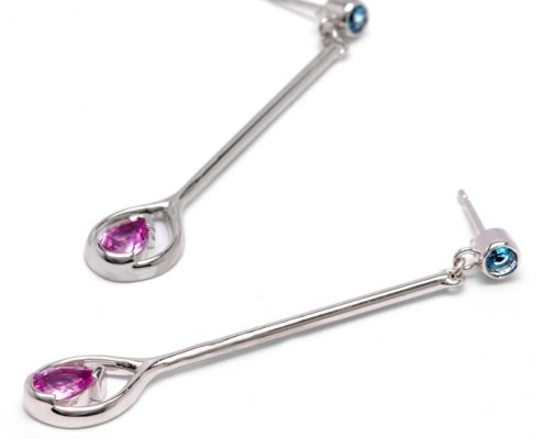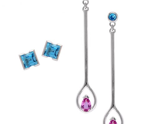 Commissioned as a 21st birthday gift alongside a matching ring. The long drop ‘evening-wear’ earrings feature demi-flush set 1ct pear faceted natural Pink Sapphire, accented with 0.60ct round brilliant full bezel set Swiss Blue Topaz. Simple square demi-flush set studs featuring 4ct princess cut Swiss Blue Topaz were designed as everyday wear complimentary earrings. All made in Sterling Silver with scroll backs.
